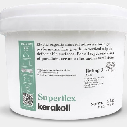 Superflex Superflex Documents  Elastic organic mineral adhesive for high performance fixing with no vertical slip on deformable surfaces. For all types and sizes of porcelain, ceramic tiles and natural stone. Superflex develops high elasticity and non‑sag effect making it safe to fix water‑sensitive ceramic tiles and natural stone even diagonally or from top to bottom on highly deformable and expandable, absorbent and non‑absorbent substrates. High adhesion and deformability Excellent workability Ideal for natural and engineered stones Floors and walls, for internal and external use Open and adjustability time ≥ 60 min. Suitable for vitrified tiles, ceramics, large formats, low thickness slabs and natural stone Ideal for marble and natural stone that tends to form stains and sag in the presence of humidityIdeal for resin‑based engineered stones Easy and light to spread thanks to the Light Work technology